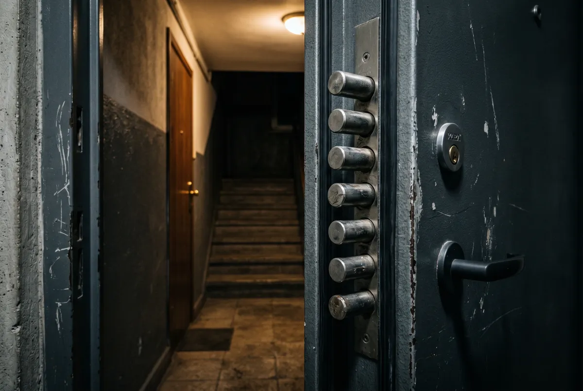 Tras un intento de manipulación (marcas en el bombín, leva girada fuera de posición, astillas en la jamba) la cerradura queda mecánicamente comprometida aunque parezca que funciona. Conviene sustituirla por un modelo de mayor seguridad y reforzar con escudo magnético.